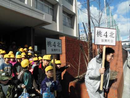 防災についての学習会が終わり、各町会別の教室にそれぞれの地域・町会の児童、保護者、地域の皆様が集まって紹介した後、各町会ごとに集団下校をして第一次避難場所を確認し、すべての活動を終了しました。