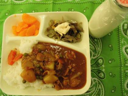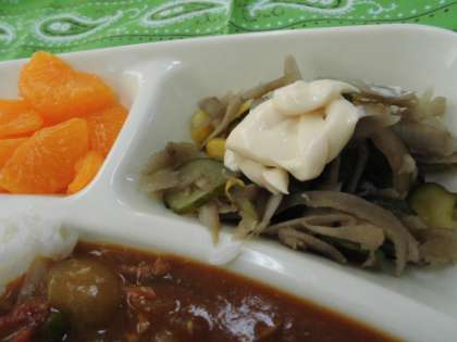献立は、ポークカレーライス、ごぼうサラダ(マヨネーズ)、みかん(缶)、牛乳でした。