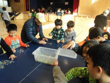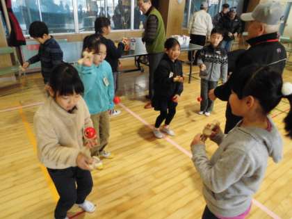 子どもたちは、グループに分かれて、順に昔遊びのコーナーをまわります。