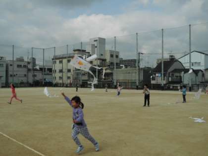 風は弱く吹いている状況でしたので、多くの子どもたちは運動場を走り回って揚げていました。