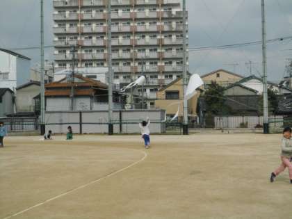 1年生が運動場で凧揚げをしました。