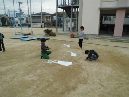 うまく風をとらえて高く揚げている子どももいますが、ひっかかったりして糸がもつれてしまった子どももいます。いろいろなことを経験することも大切な学びです。