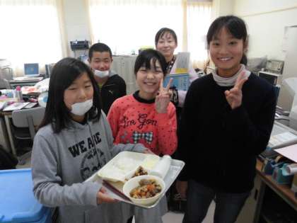 教室では、班の中に入っていろいろな話をしながら給食を楽しく食べていました。