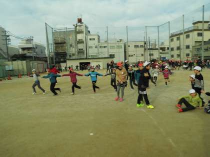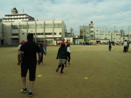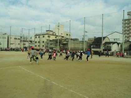 子どもたちは寒さに負けず運動場いっぱいに広がって、縦割りグループで楽しんでいます。
