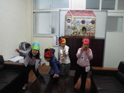 1年生の子どもたちが、各自が作ったオニの面をかぶって校長室へ来てくれました。