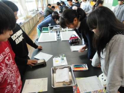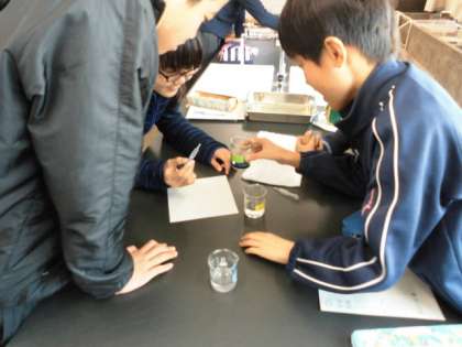 水溶液の中和というところをBTB液、石灰水、酢を使って実験しました。