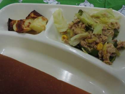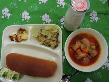 献立は、ミートボールのケチャップ煮、ツナと野菜のソテー、焼きじゃが、パン、マーガリン、牛乳でした。