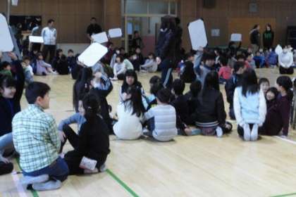 今朝の児童集会は、集会委員会による〇×クイズでした。