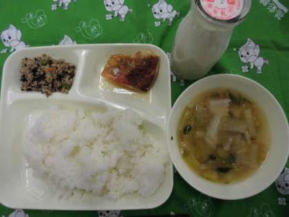 献立は、赤魚のレモンじょうゆかけ、うすくず汁、高野どうふのいり煮、ごはん、牛乳でした。
