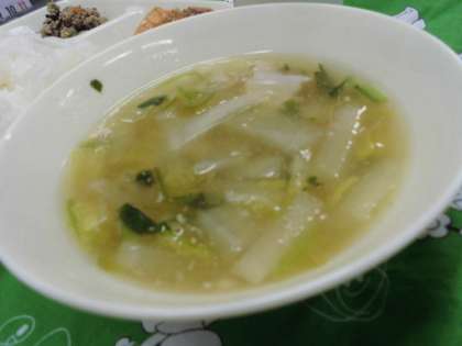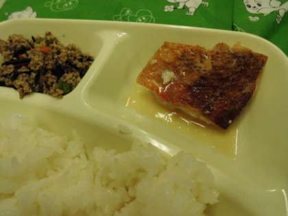 魚の献立は、子どもたちの人気メニュー第二位です。赤魚のレモンじょうゆかけも、最後にレモン汁を加えて煮るのがよく効いており、レモンの酸味と爽やかさ、赤魚のしっかりした食感とよく合って、とてもおいしくいただきました。