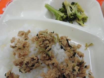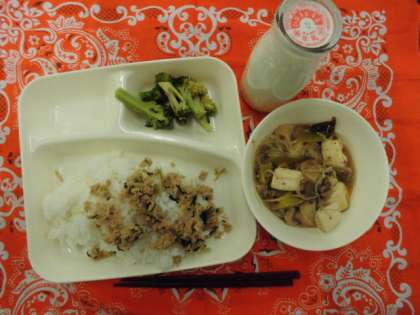 献立は、すき焼き煮、ブロッコリーのしょうがづけ、ツナっ葉いため、ごはん、牛乳でした。