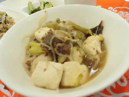すき焼き煮は牛肉はもちろんですが、ふ、糸こんにゃく、はくさい、白ねぎ、とうふ、えのきだけなど具だくさんの献立です。そして、それぞれの具材は、下味をつけたり、調理する順序があったりして、よりおいしいものに仕上がります。とても、おいしくいただきました。