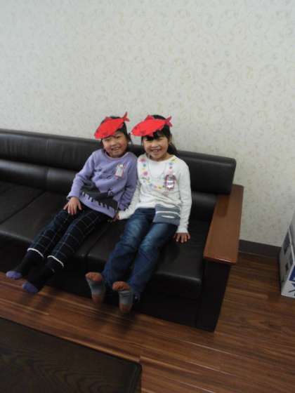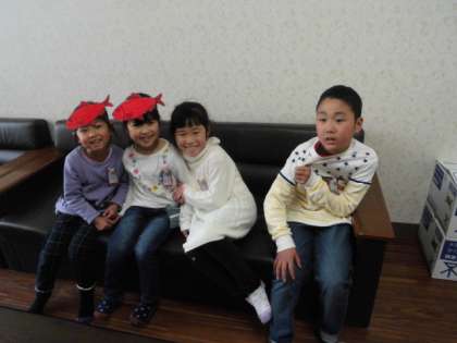 1年生の子どもたちが国語科で学習しているスイミーの魚を頭にかぶって校長室に来てくれました。