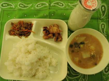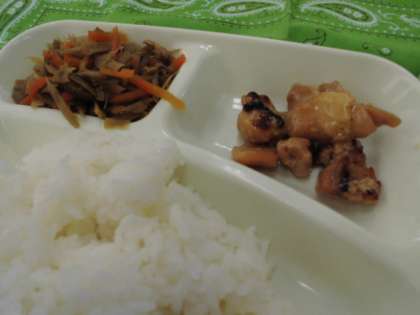 鶏肉の照り焼き、さつまいものみそ汁、きんぴらごぼう、ごはん、牛乳でした。