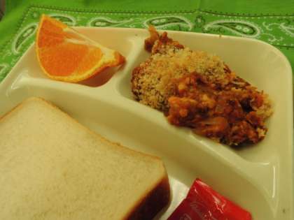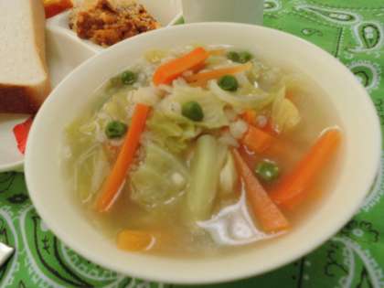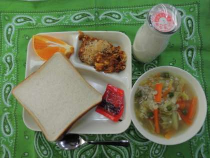 献立は、とうふのミートグラタン、麦と野菜のスープ、デコポン、パン、ジャム、牛乳でした。