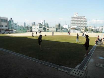 今日の天気は不安定ですが、晴れ間を見つけて5年生の子どもたちが芝生でキックベースボールをして楽しんでいました。