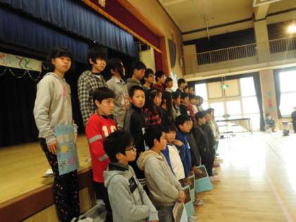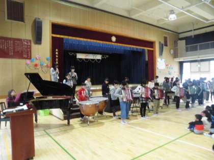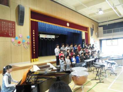 在校生からの呼びかけやプレゼントをいただいた後、6年生からお礼の歌、合奏がありました。