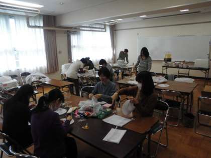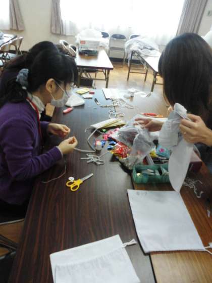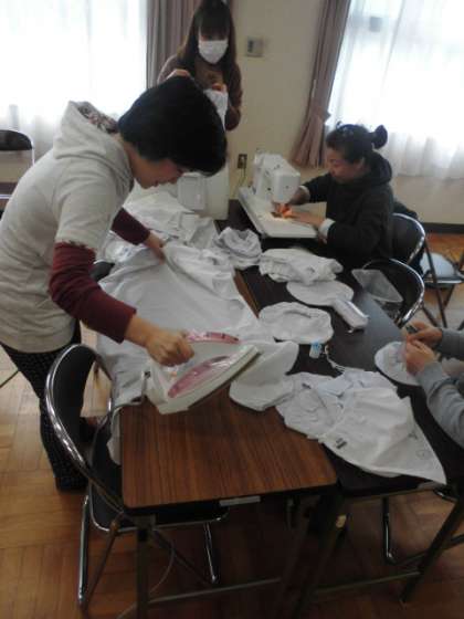 PTA図書給食委員会が中心となって、PTA全会員の皆様に参加協力を呼びかけた給食エプロン補修を多目的室でしていただいていました。