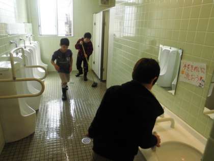 1年2組、2年1組、一階南館トイレ掃除の掃除の様子です。