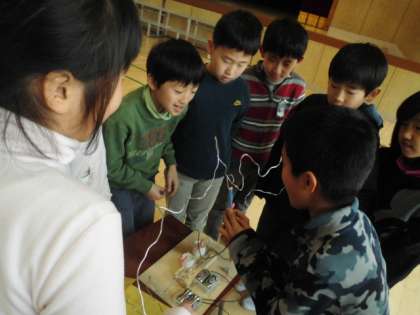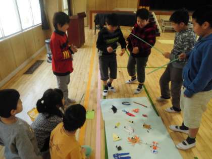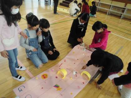 3年生が理科の時間として、これまで学んできた磁石や電気のことを使ってゲームを企画し、4年生を招待して楽しんでもらう活動をしていました。