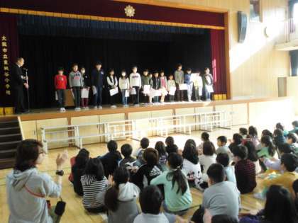 今朝は児童朝会として、講堂で第53回全大阪幼少年美術展において表彰された児童に直接賞状を授与しました。