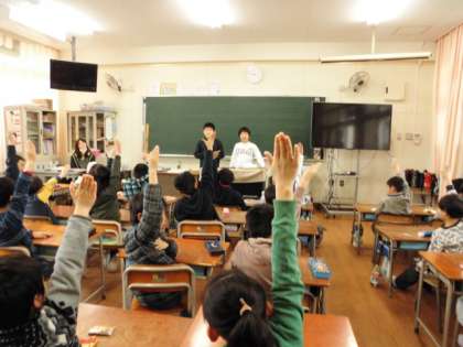 「朝、歯磨きをしてきた人は、手を挙げてください」という声に、2年1組の子どもたちは、出席者全員が手を挙げていました。