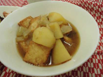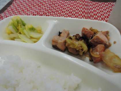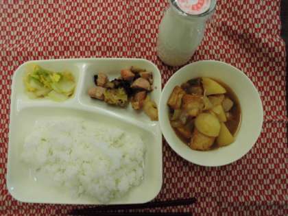 献立は、さけのしょうゆバター焼き、あつあげとじゃがいもの煮物、はくさいのおひたし、ごはん、牛乳でした。