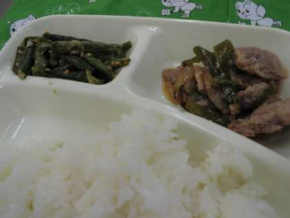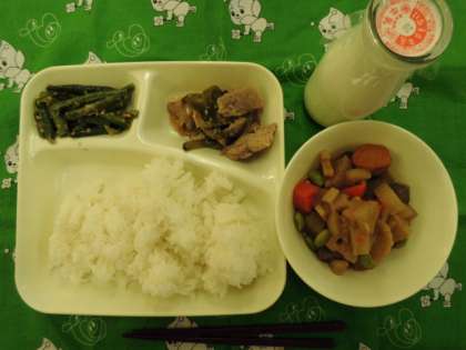 献立は、豚肉の甘辛焼き、三色揚げ天と野菜の煮物、三度豆のごまあえ、ごはん、牛乳でした。