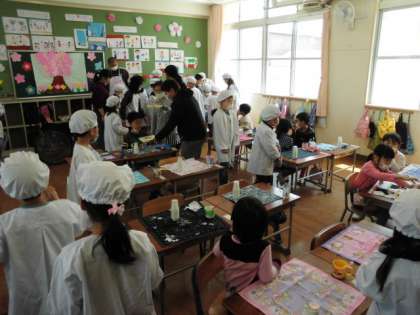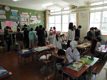 今日も6年生が1年生の教室へ来て、配膳のお手伝いをしました。