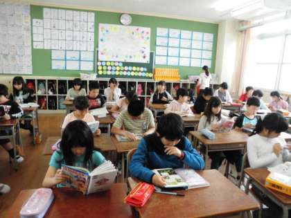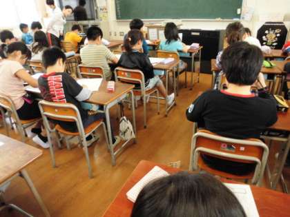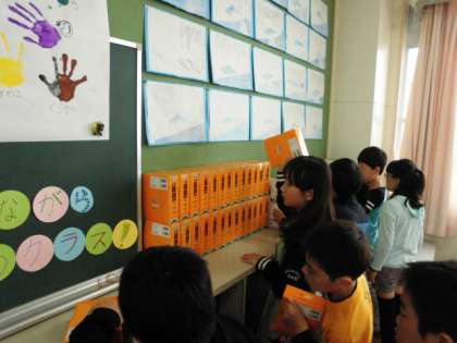 一定の時間が過ぎて、わからない漢字があった児童は、教室後ろのロッカーに常置している国語辞典で調べていました。