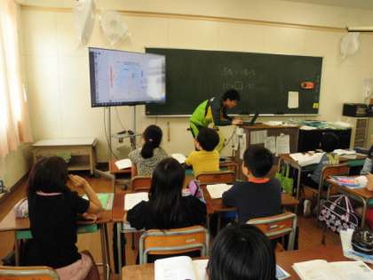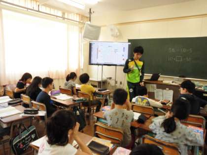 こちらでは、算数のデジタル教科書を大型モニターに映して学習を進めています。