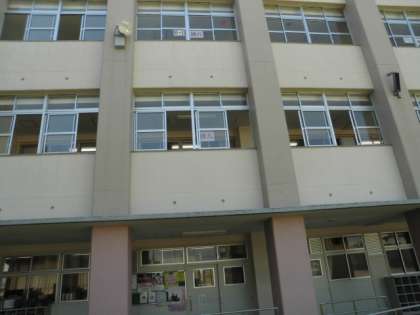 廊下側の窓には地域名を記したシートを貼っています。