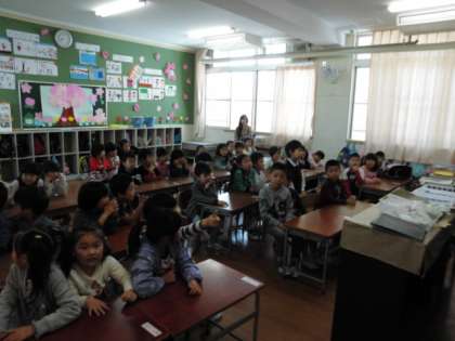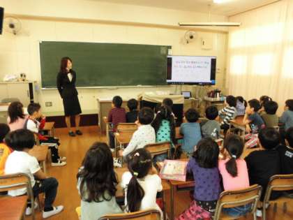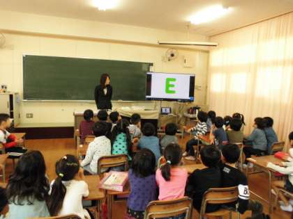 1年生は、2組の教室に集まって、DVDを視聴しながら英語活動をしていました。