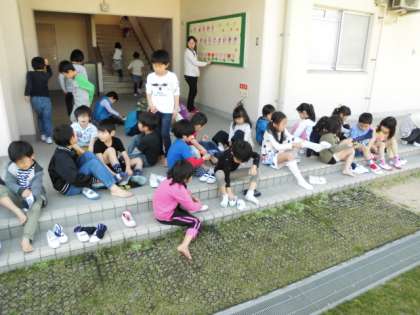 休み時間終了のチャイムが鳴ったら、子どもたちはすぐさま靴下、靴をはきに来ます。