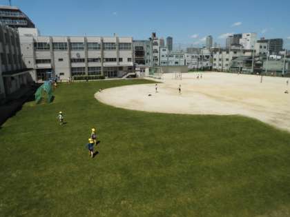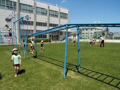 休み時間に遊んでいた子どもたちがいなくなって空いた芝生で、東桃谷幼児の園の園児たちが芝生で遊んでいます。運動場では、4年生が体育をしていました。