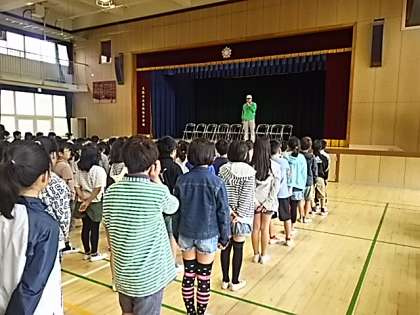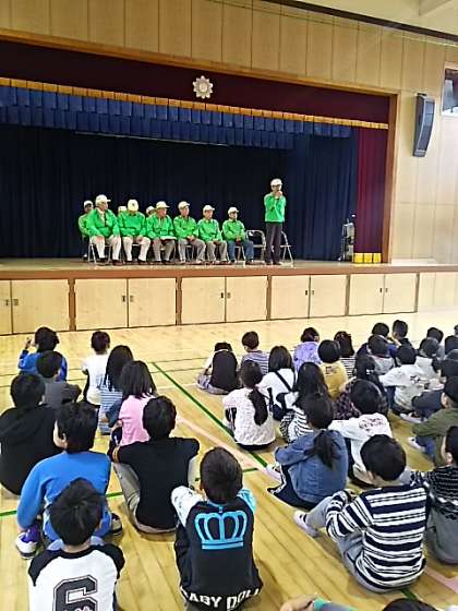 東桃谷小学校見守り隊の皆様にご来校いただき、子どもたちとの対面式を行いました。真剱防犯支部長様からの挨拶、そしてお一人お一人からの言葉をいただきました。松原まちづくり協議会理事長様に最後にお言葉をいただいた後、校長からお礼の挨拶をいたしました。これまでも、そしてこれからも子どもたちのことをよろしくお願いいたします。