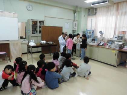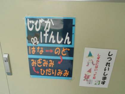保健室へ行くと、1年2組の子どもたちが耳鼻科校医先生による検診を受けていました。子どもたちは、静かに自分の番が来るのを待っていました。