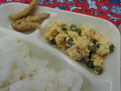 献立は、きびなごのてんぷら、みそ汁、えんどうの卵とじ、ごはん、牛乳でした。