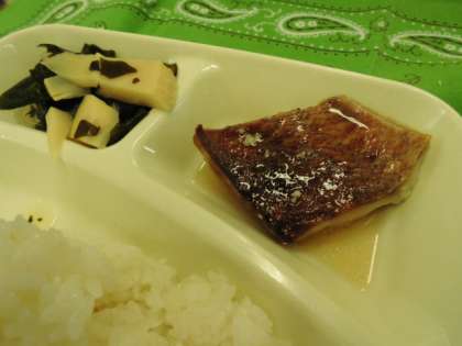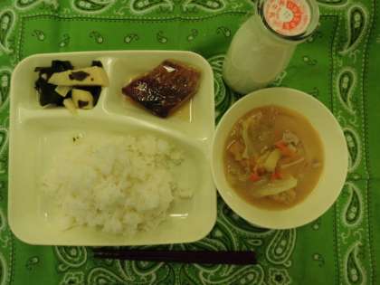 献立は、赤魚のしょうゆだれかけ、みそ汁、わかたけ煮、ごはん、牛乳でした。