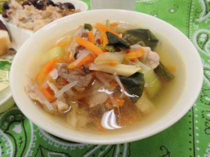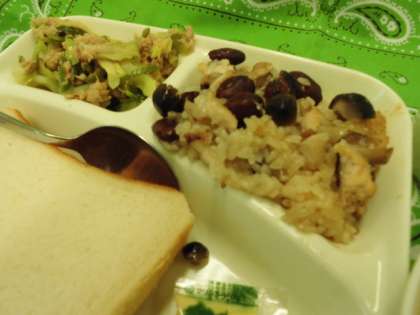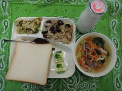 献立は、金時豆の中華おこわ、中華スープ、ツナと野菜のオイスターソースいため、パン、牛乳でした。