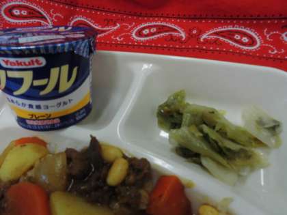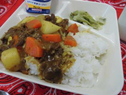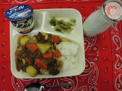献立は、牛肉と大豆のカレーライス、レタスのサラダ、ヨーグルト、牛乳でした。