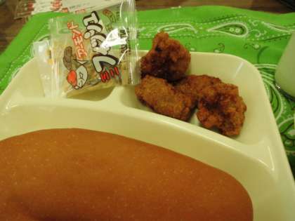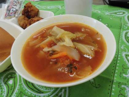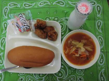 献立は、一口トンカツ、ミネストローネ、アーモンドフィッシュ、パン、牛乳でした。