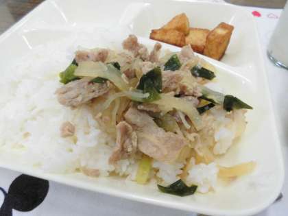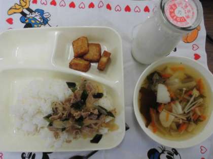 献立は、豚丼、五目汁、あつあげのしょうがじょうゆかけ、ごはん、牛乳でした。