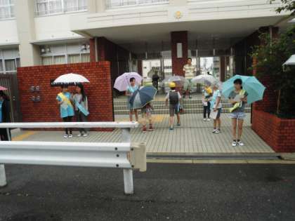 雨模様ですが、担当児童が正門へ出てあいさつ運動をしています。