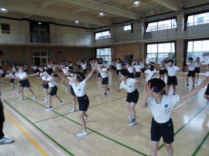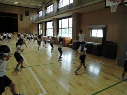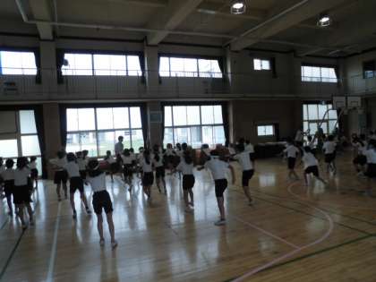 3・4年生が講堂で運動会練習をしていました。