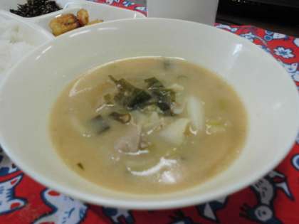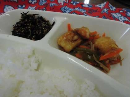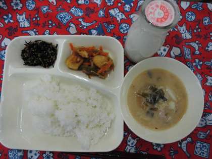 献立は、さけの野菜たっぷりあんかけ、みそ汁、まぜまぜふりかけ、ごはん、牛乳でした。