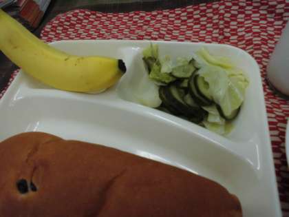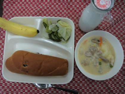 献立は、コーンクリームシチュー、グリーンサラダ、バナナ、パン、牛乳でした。