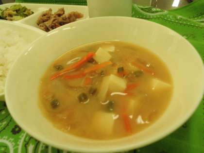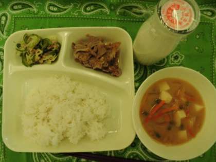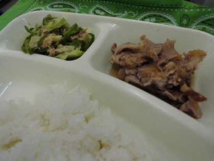 献立は、豚肉のおろしじょうゆかけ、みそ汁、野菜いため、ごはん、牛乳でした。