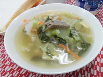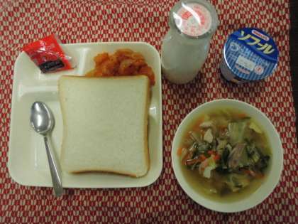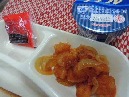 献立は、えびのチリソース、中華スープ、ヨーグルト、パン、ジャム、牛乳でした。
