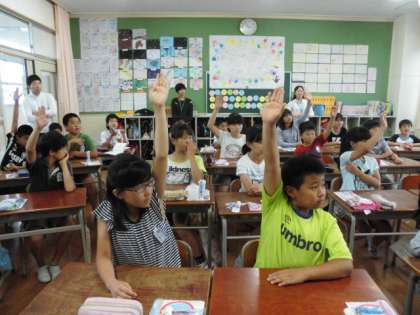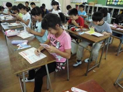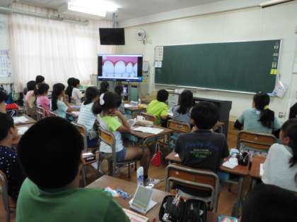 5年生の子どもたちは、真剣な表情で集中して歯みがきの大切さについて学びました。